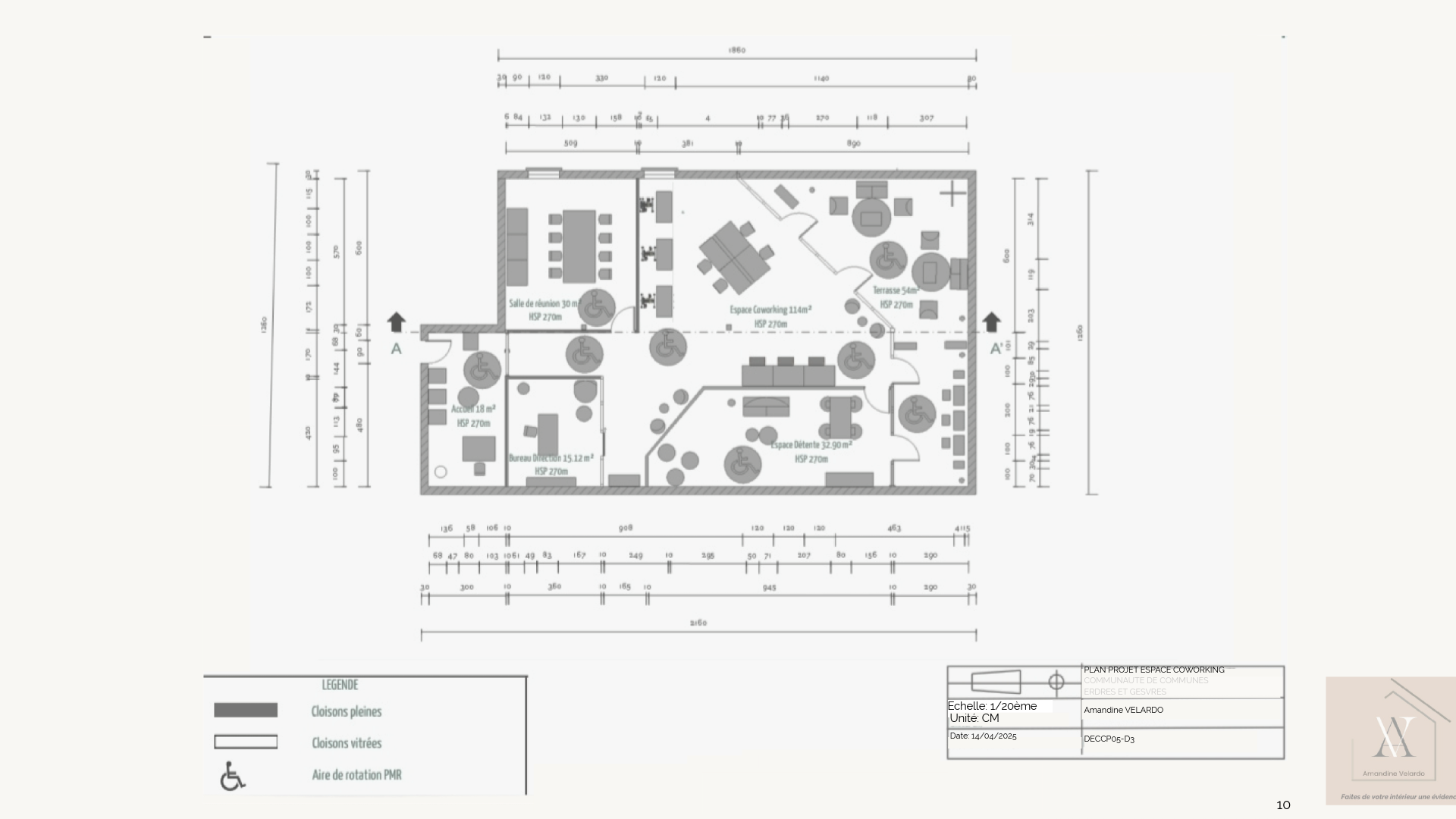 L’ensemble comprend une zone d’accueil, un bureau de direction, une salle de réunion, une zone de coworking, un espace